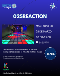 - 025REACTIONUna experiencia de ocio tecnológico y agilidad para jóvenes de 18 a 35 años: ¡Inscríbete antes del 20 de marzo y no te quedes fuera!… Seguir leyendo 025REACTION