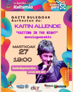 - Kaitin Allende llega a Barakaldo con su monólogo «Kaitin in the Night»Una cita con el humor y la cultura en euskera el próximo 27 de marzo, dentro de la programación de la 24. Korrika. Gazte Bulegoa… Seguir leyendo Kaitin Allende llega a Barakaldo con su monólogo «Kaitin in the Night»